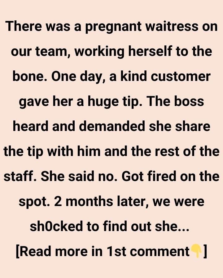 There was a pregnant waitress on our team, working herself to the bone. One day, a kind customer gave her a huge tip. The boss heard and demanded she share the tip with him and the rest of the staff. She said no. Got fired on the spot.