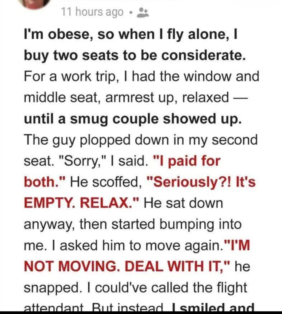 That flight reminded me: I don’t owe anyone smallness. I deserve space — and next time someone tries to shame me for it, I’ll be ready.