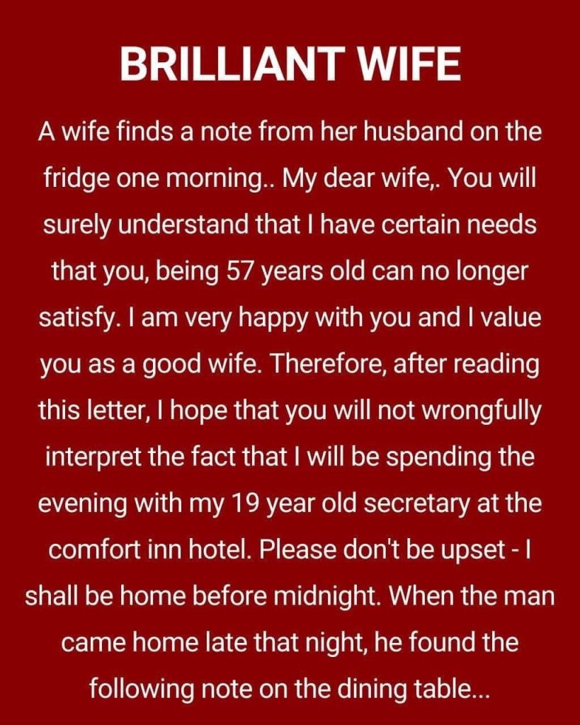 You will surely understand that I have certain needs that you, being 57 years old, can no longer satisfy. I am very happy with you and value you as a good wife. Therefore, after reading this letter, I hope you will not wrongfully interpret the fact that I will be spending the evening with my 19-year-old secretary at the Comfort Inn Hotel.