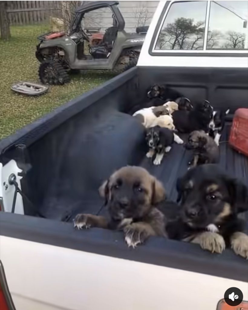 A quick investigation revealed a heartbreaking sight in the truck bed: a litter of small, shivering puppies. They were alone, dirty, and huddled together for warmth with no sign of their mother or an owner.